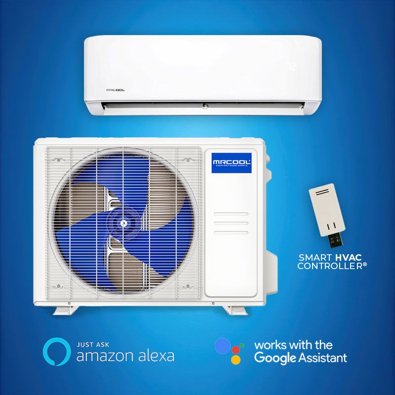 The MRCOOL Advantage 5th Generation single-zone mini split offers efficient heating and cooling with a 12,000 BTU capacity and a high 21.3 SEER2 / 9.1 HSPF2-4 rating. Designed for rooms up to 550 square feet, it uses eco-friendly R-454B refrigerant. The system includes a quiet indoor air handler and an inverter-driven outdoor condenser with Gold Fin corrosion-resistant coating and built-in Wi-Fi Smart HVAC Controller for smartphone and voice control.