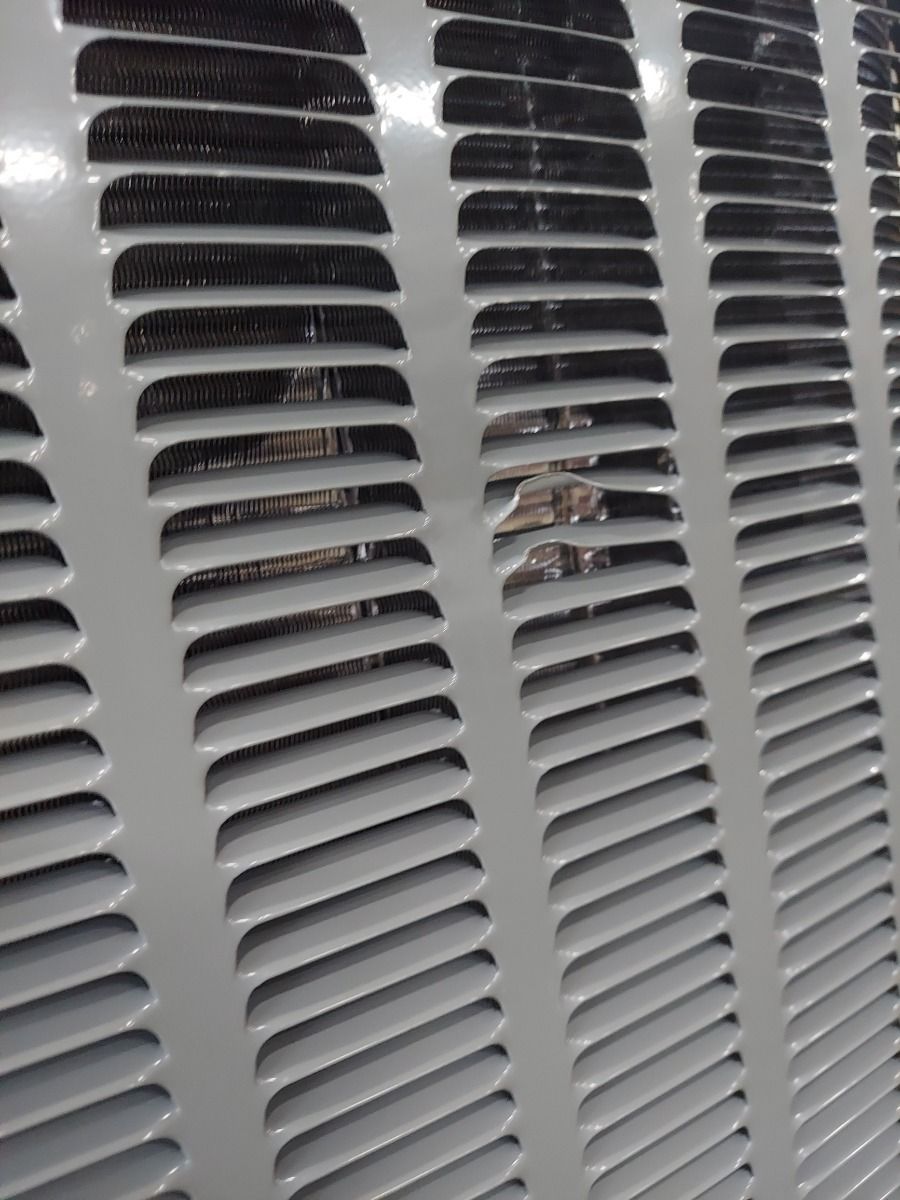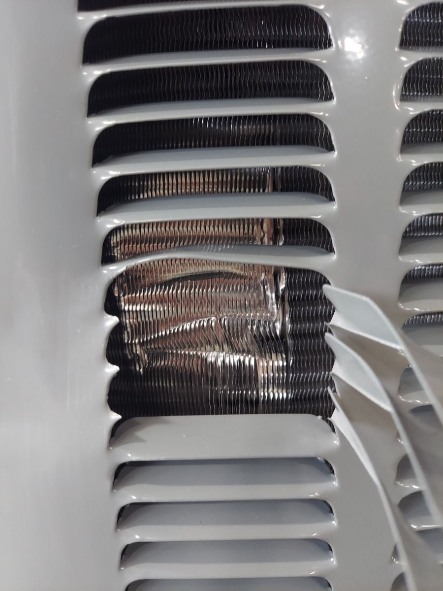 New, never used. The unit has a dented outer guard and bent coil fins. Product is sold as-is, please refer to pictures.