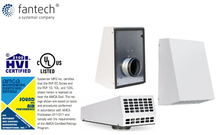 Warranty ConditionsThe Fantech RVF fan series is engineered for exterior wall-mounted ventilation, combining rugged materials and design features to withstand weather, humidity, and airborne contaminants. Its housing is constructed from galvanized steel with a baked-on powder-coat finish (RAL 9016 white by default), offering strong protection against corrosion, rust, and UV degradation. Inside, the fan uses an external-rotor motor with a backward-curve impeller that is compact, efficient, and designed to remain cooler during operation. The motor is totally enclosed, enabling the fan to operate reliably even in humid, dusty, or lint-laden air. For protection and longevity, the RVF includes automatic reset thermal overload protection, guarding the motor from overheating. A rubber gasket ensures a tight seal for duct connections, minimizing air leaks.